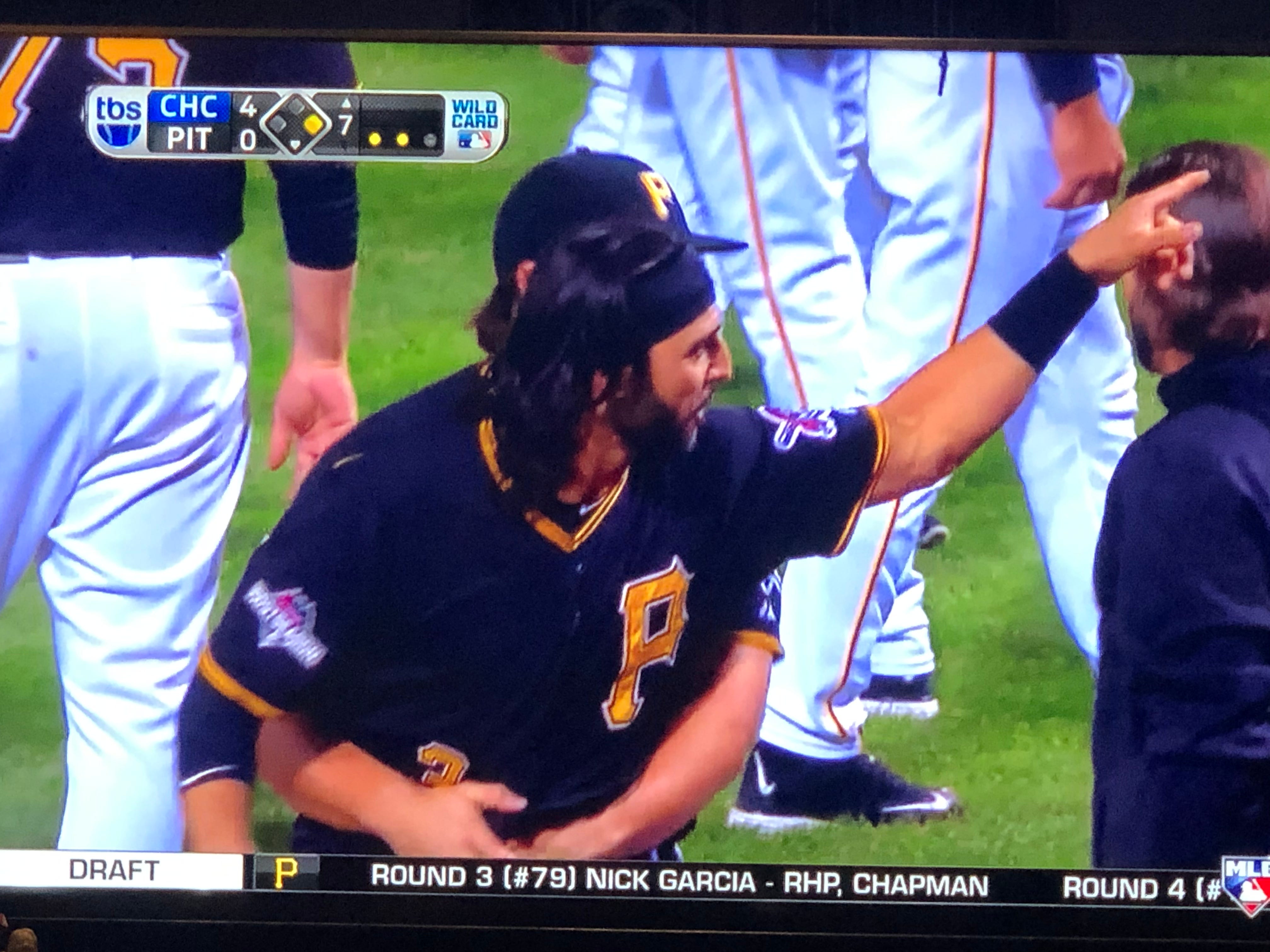 Cole throws up and in to Bryant on a 1-2 pitch and missed him and then ends up walking him. The Pirates are a red-assed bunch under the best of circumstances, and these, for them, are now really NOT the best of circumstances.