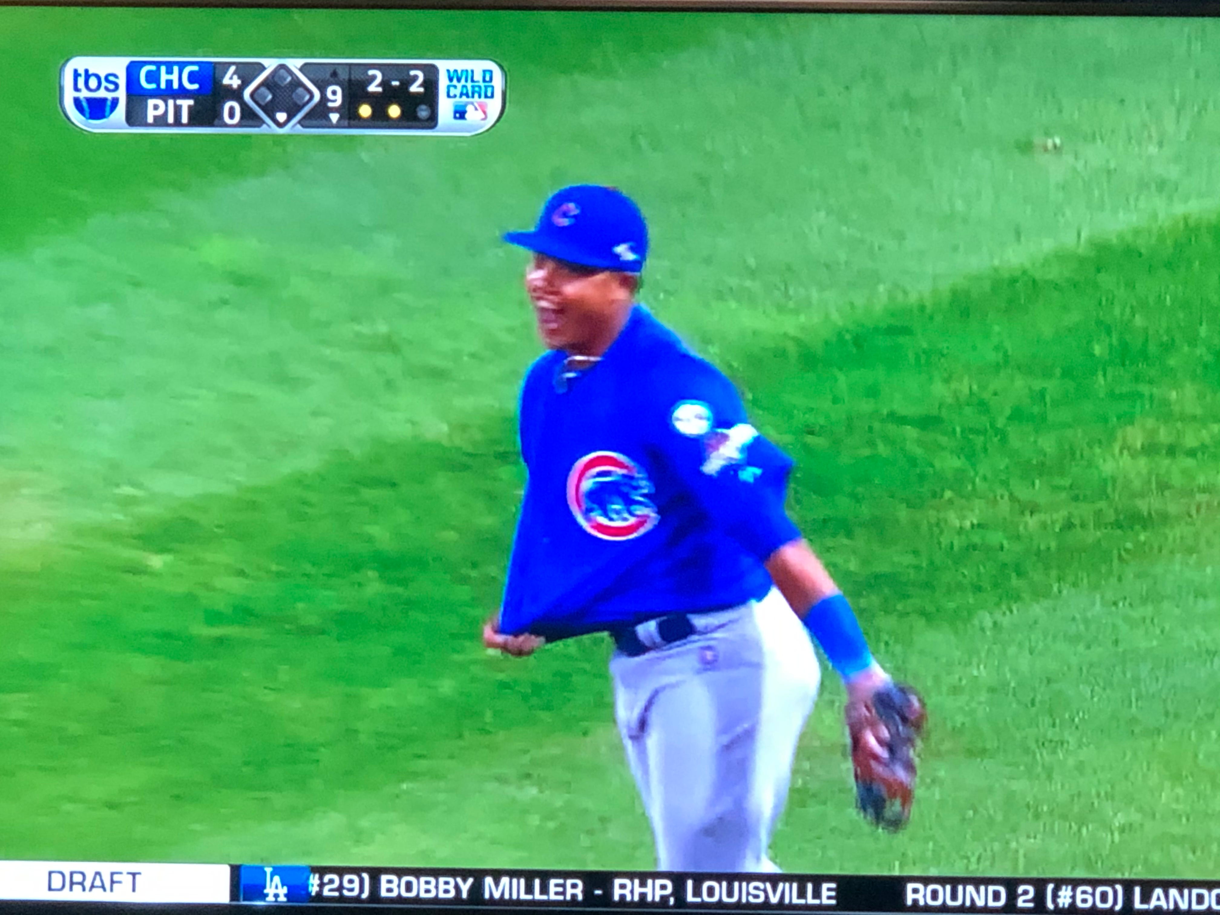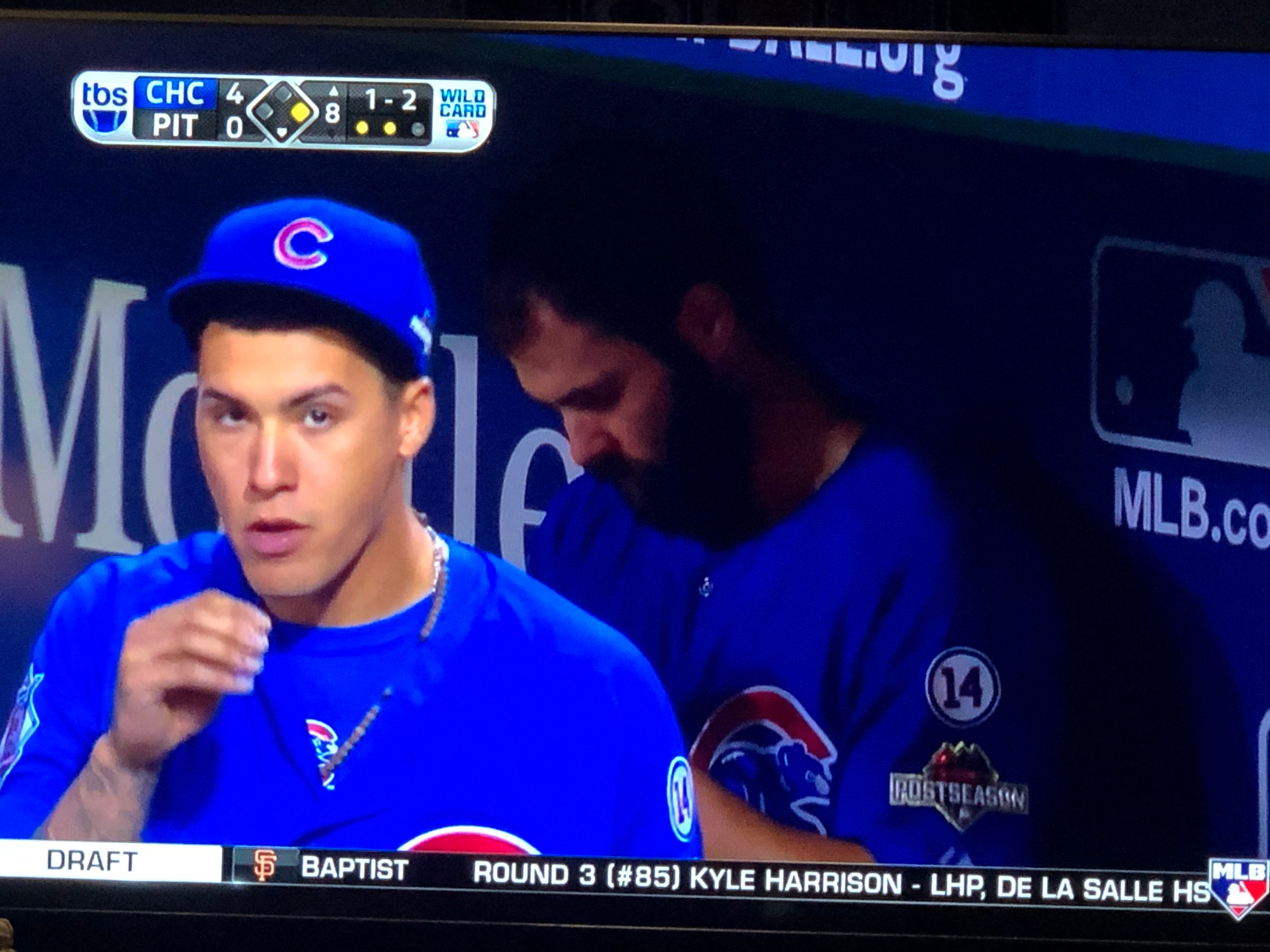 The Pirates finally test Schwarber in right, as Harrison and McCutchen both fly out to him. Meanwhile the TBS guys are interviewing Joe in the dugout. Joe plays the hits with, “Jake’s being Jake. The ball’s looking good out of his hand from down here.”