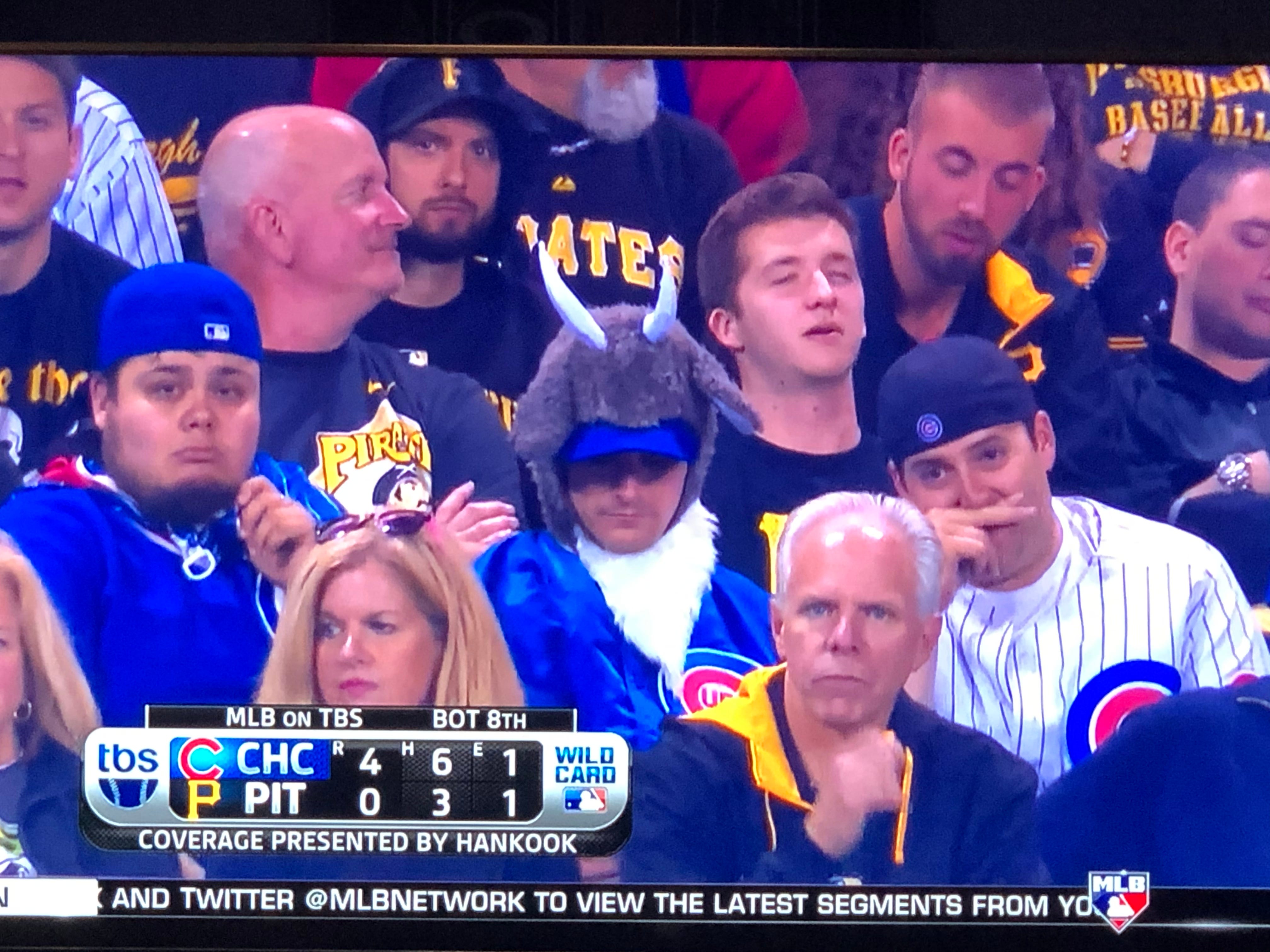First there's the dumbass dressed as a goat (you have no idea how glad I am that that shit is gone forever), I don't know where the guy next to him's fingers have been, and the Pirates fan a row behind them who is either coming to grips with their three year flirtation with being relevant being over in six outs, or maybe he's where those fingers just were?