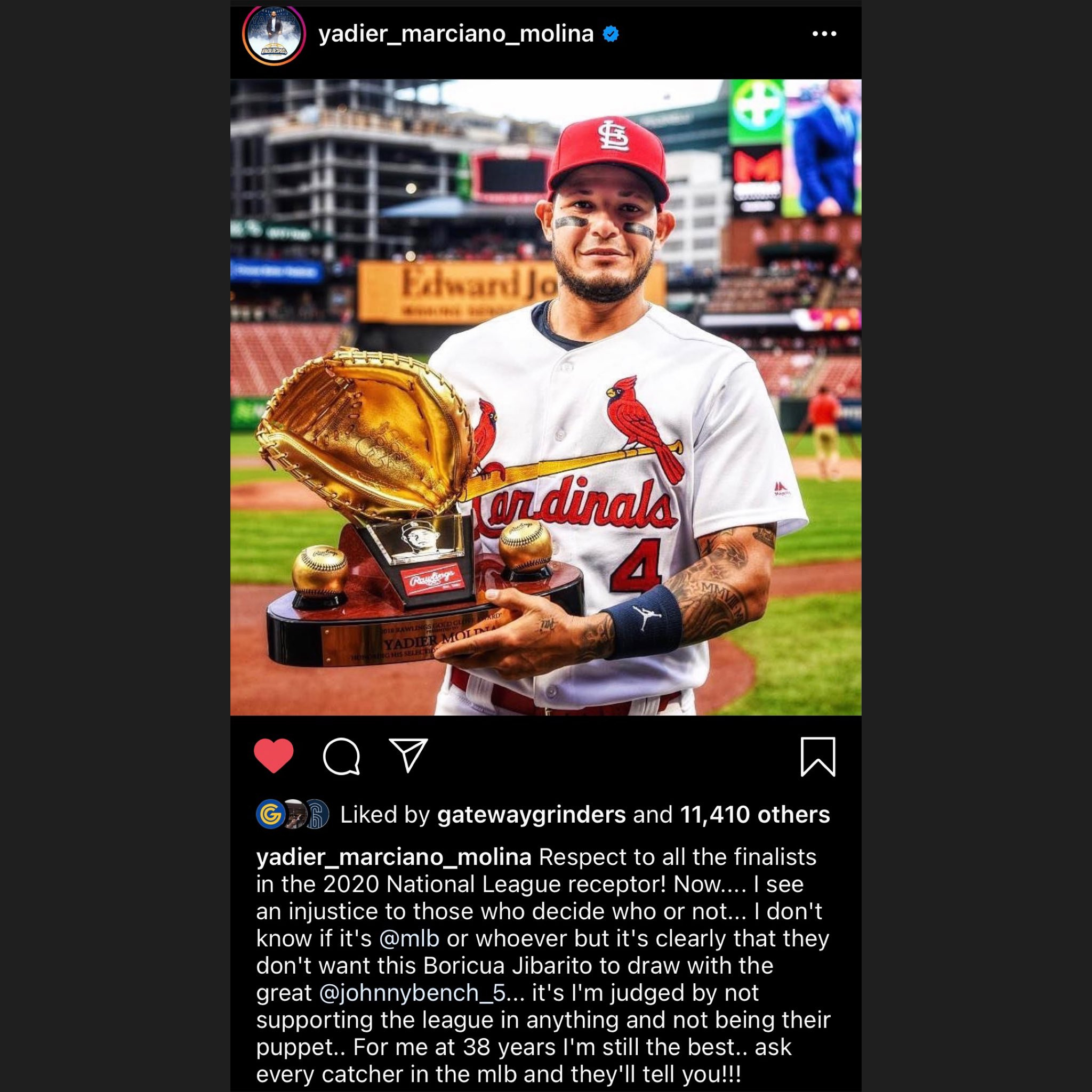Keep it classy, Yadi. He’s been coasting on his reputation for at least six years now, and he won the Gold Glove just two years ago mostly because people were just used to voting for him. I find it hard to believe anybody but Johnny Bench gives a shit if he ties him for most catching Gokd Gloves at ten. The reason he wasn’t a finalist is simply that he’s not one of the three best defensive catchers in his league anymore. In fact, since JT Realmuto also wasn’t a finalist it means Yadi didn’t even come close to being nominated. Hell, he’s at best the fourth best catcher in his own division, since Contreras, Tucker Barnhart and Jacob Stallings are all in the NL Central. Yadi’s lucky Yasmani Grandal left the Brewers or he’d have been dead last.