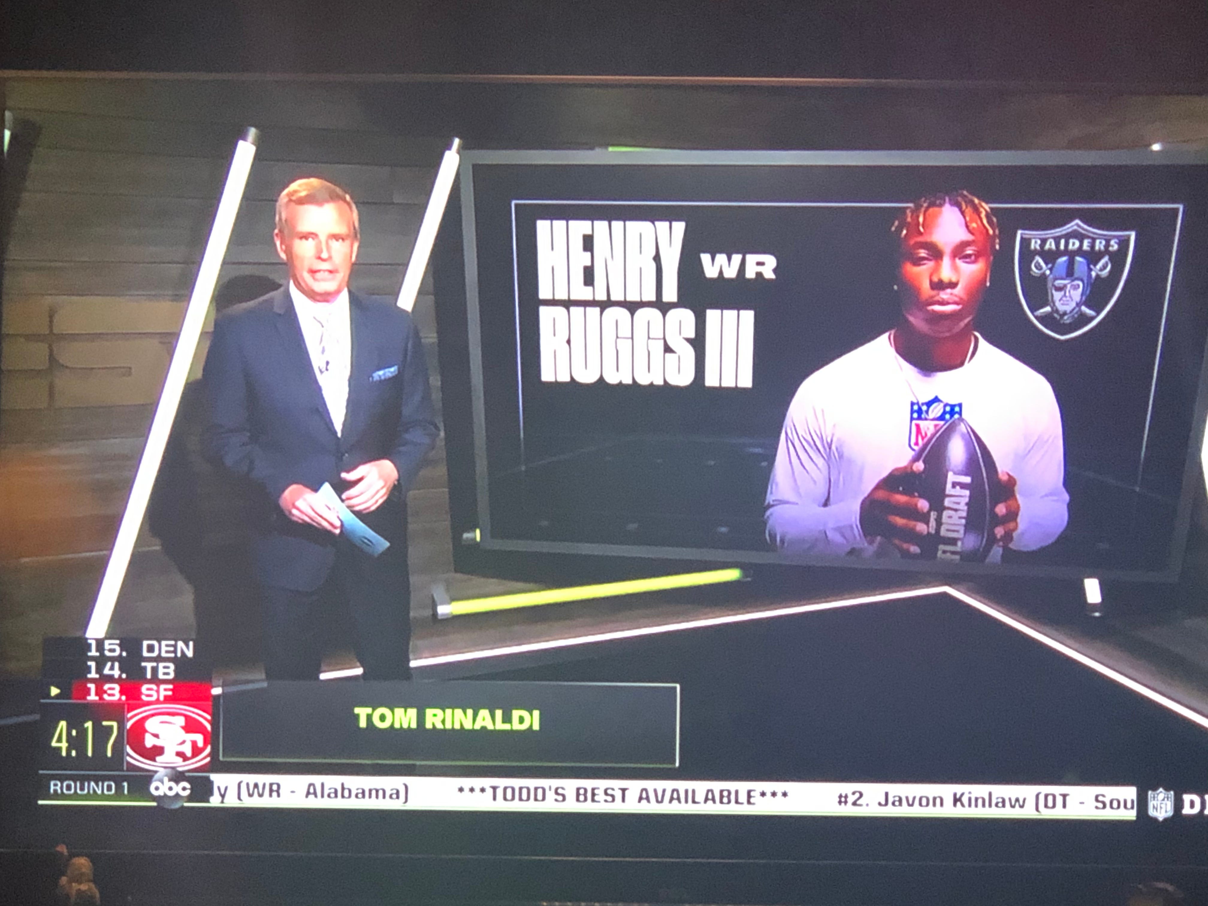 Few were more excited for Ruggs to be drafted than Tom Rinaldi, who gets to do one of his weepy features on him because Ruggs' best friend died in a car accident in high school. Nobody sucks the life out of an event quiet like Tom Rinaldi.