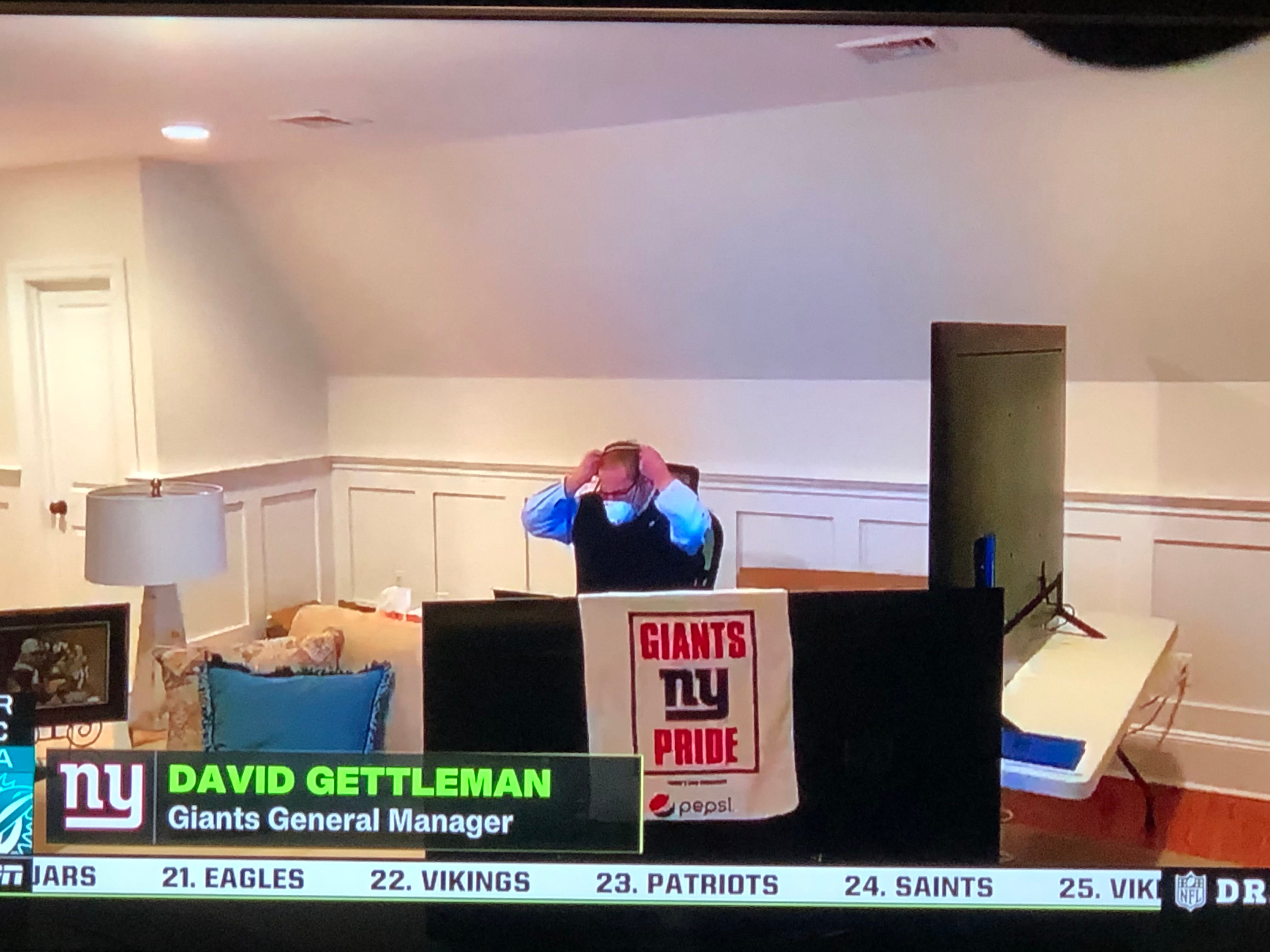 Here’s Giants GM Dave Gettleman putting a mask on, to meet with no one while alone in a room. As one does.
