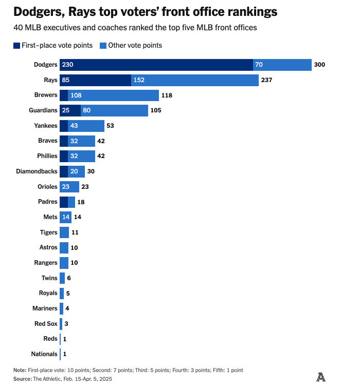 For the second straight year, The Athletic charged Tyler Kepner with calling around to every front office in baseball with one simple question. "Can you name the five other front offices that you think do the best job?"