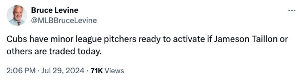Regardless, it felt like if the Cubs felt they were close to a deal for Taillon that they wouldn’t risk letting him take his start last night, where he might get hurt or give up six runs in four innings, or something. Crazy, right?