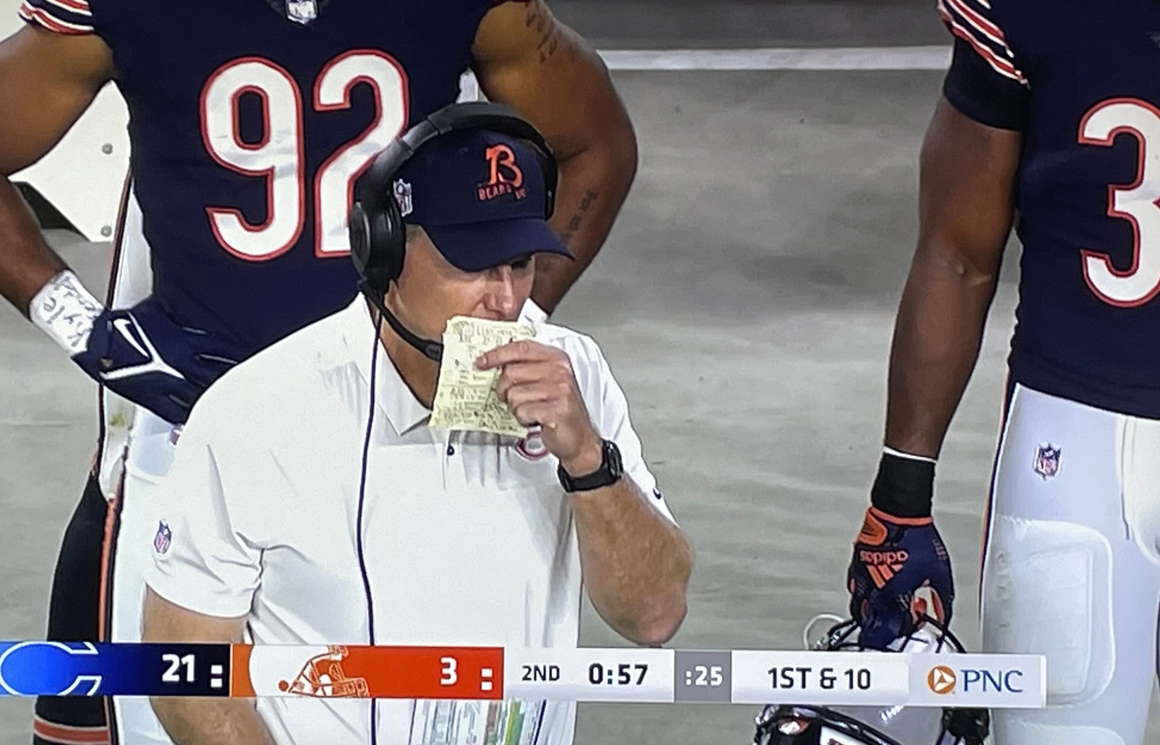 Cleveland faces a forth and nine with 1:09 and they’re kicking the field goal. York makes a 57 yarder. It’s 21-3 Bears. Fields has taken off his rib pads and doesn’t have his helmet. If he’s staying in for the final minute of the half he’s getting pretty cocky.