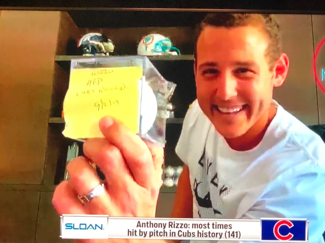 Rizzo points out the balls on the bookcase behind him, and says a lot are from when he broke the hit by pitch record. He then proves it.