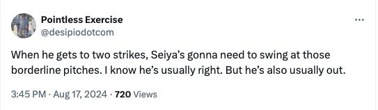 I kind of worry that now that Seiya is the Cubs primary DH with Cody Bellinger playing right field that Seiya’s going to actually be more selective because he’s got nothing to do between at bats but look at his at bats over and over on the iPad or back in the video room and obsess over that little rectangle that is supposed to depict the strike zone.