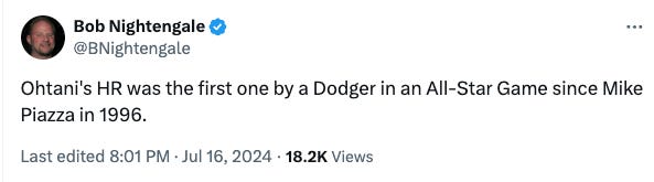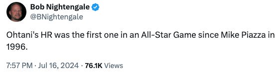 Oh. Bob was only off by a few. Ohtani’s was the 65th All-Star Game homer since Piazza’s in 1996.