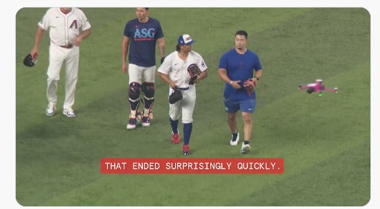 Fox’s awful intro package featured All-Stars getting on and doing some very carefully edited “riding” on a mechanical bull. How great would it have been if Shohei had actually fallen off it and separated his shoulder and missed the rest of the season?