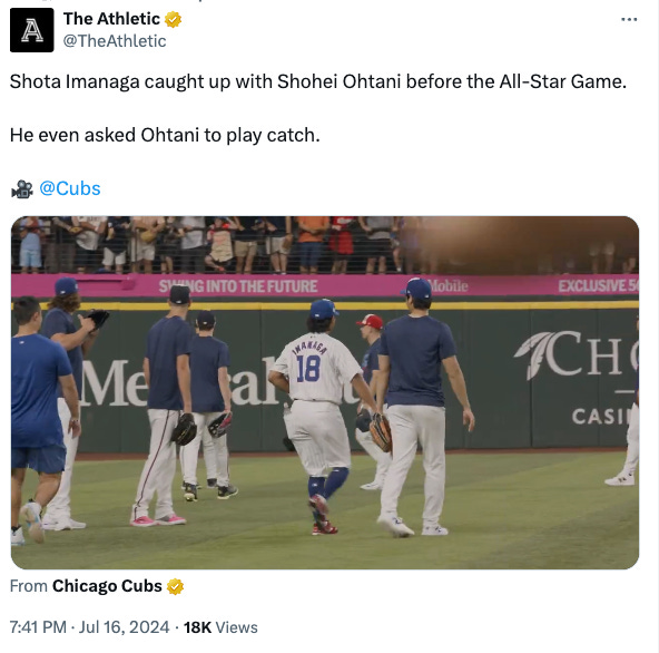 Shōta gets Vlad Jr. to ground out to second and then after Christian Yelich dogged it and didn’t catch a foul fly ball to right, Shōta strikes out Adley Rutschman on a check swing. Another thing that should never happen in an All-Star Game, a base ump ringing up a player for a check swing. “Timmy, did you see Adley kind of swing at that ball? Wasn’t it exciting?!”