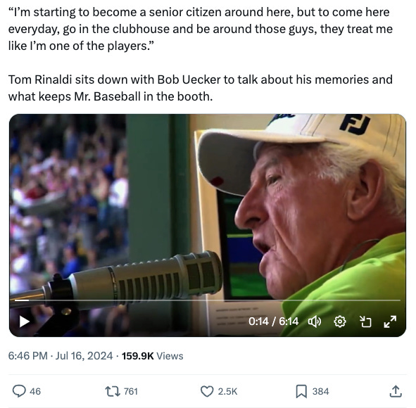 Fox did a pre-game feature on 90-year-old national treasure Bob Uecker. Do you think that when they told Ueck that they were sending tragedy porn interviewer Tom Rinaldi to do the interview that Bob worried he might have already died?
