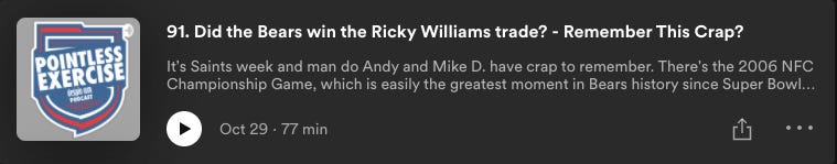 Mike D. and I Remembered This Crap, again, and this time we dug into the 2006 NFC title game, the Ricky Williams trade (seriously, it had a huge impact on the Bears), Rick and Paul Reuschel, me not wearing a tie to my god daughter’s baptism, Leon Johnson’s facemask and much, much more.